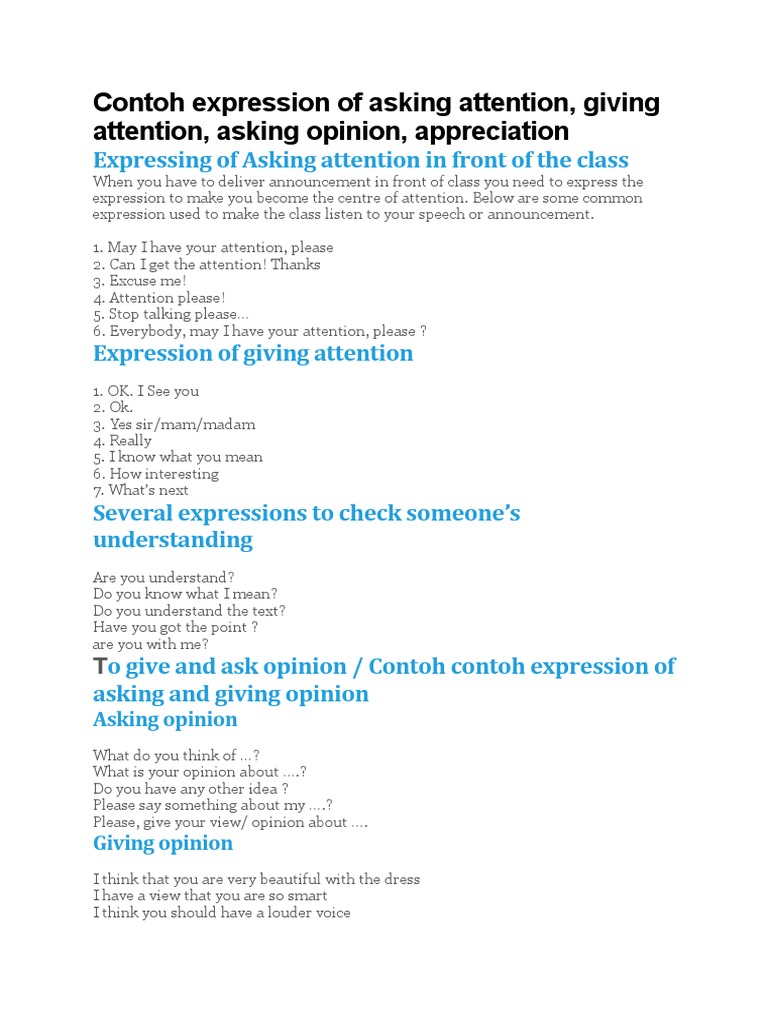 Contoh ungkapan asking and showing attention. Hai sobat blogger lama gue gak nge.post karena sibuk sono situ :d kali ini saya akan memposting materi bahasa inggris yang berjudul asking and giving opinion. The teacher is explaining the material , the students are not paying the teacher explanations. Contoh expression asking for and showing attention. Asking for advice and offering advice.