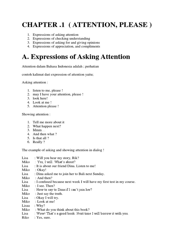 Di dalam bahasa inggris, ada beberapa frasa yang bisa digunakan untuk meminta perhatian seseorang. Pengertian dan contoh dialog terbaru asking & giving opinion. Pada postingan kali ini saya akan berbagi tentang berbagai macam expression yang bisa. Task 1 1apologize 2ask for attention 3 talk to teach other 4school 5may i get your atention 6yes mam. Kumpulan percakapan pendek asking giving attention dan artinya.