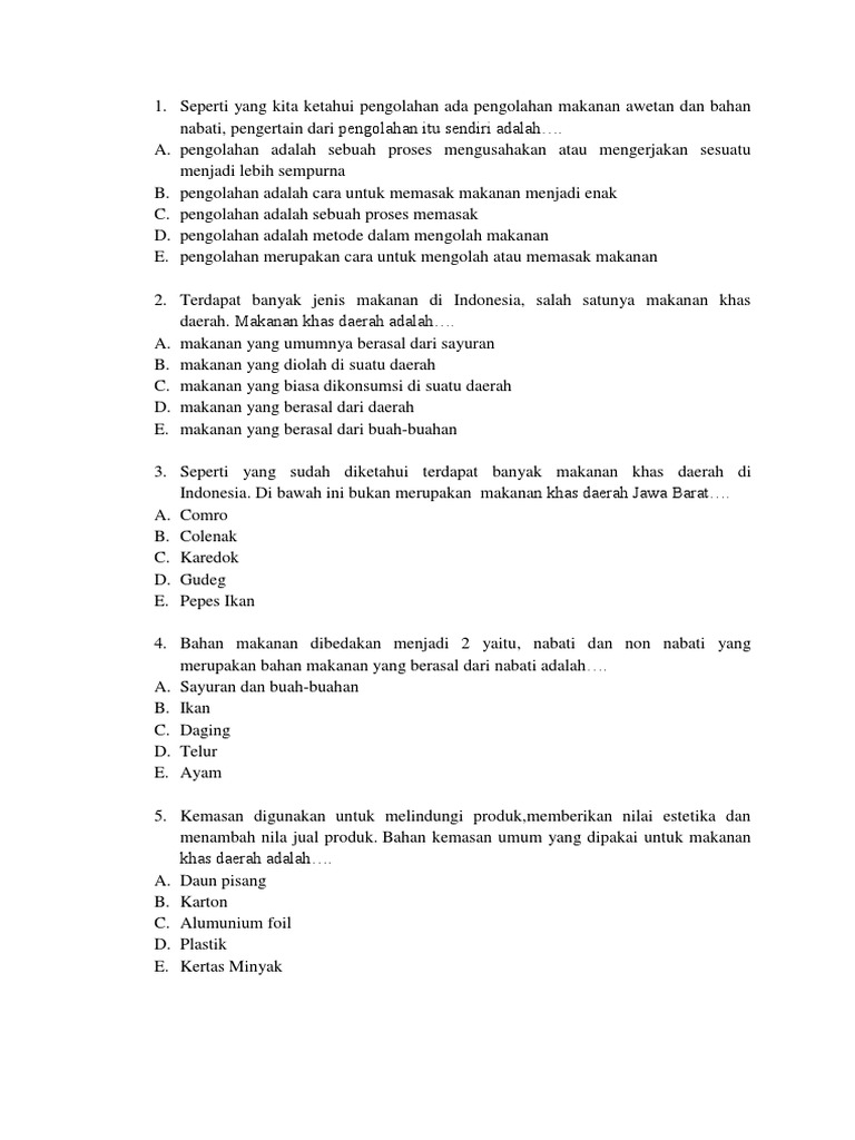 Sayur teknik pengolahan makanan khas daerah. Apa yang dimaksud dengan makanan khas daerah? Teknologi pengemasan perkembangan sangat pesat khususnya pengemas plstik yang dengan drastic. Sumber daya yang dibutuhkan dalam usaha pengolahan makanan. Pengolahan makanan awetan dari nabati.